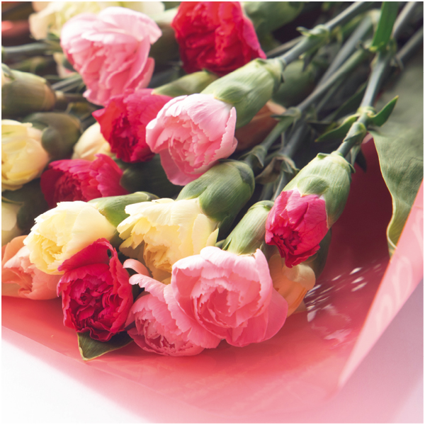 カラフルなスプレー咲きカーネーションを束ねた、目にも鮮やかなブーケ。母の日のうれしい気分を盛り上げてくれます。